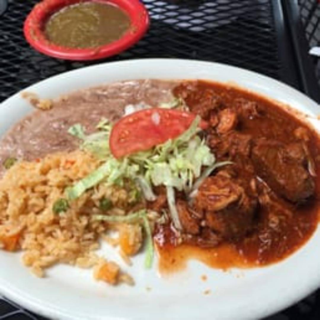 A dish featuring meat, typically pork, marinated and cooked in a red chile sauce.