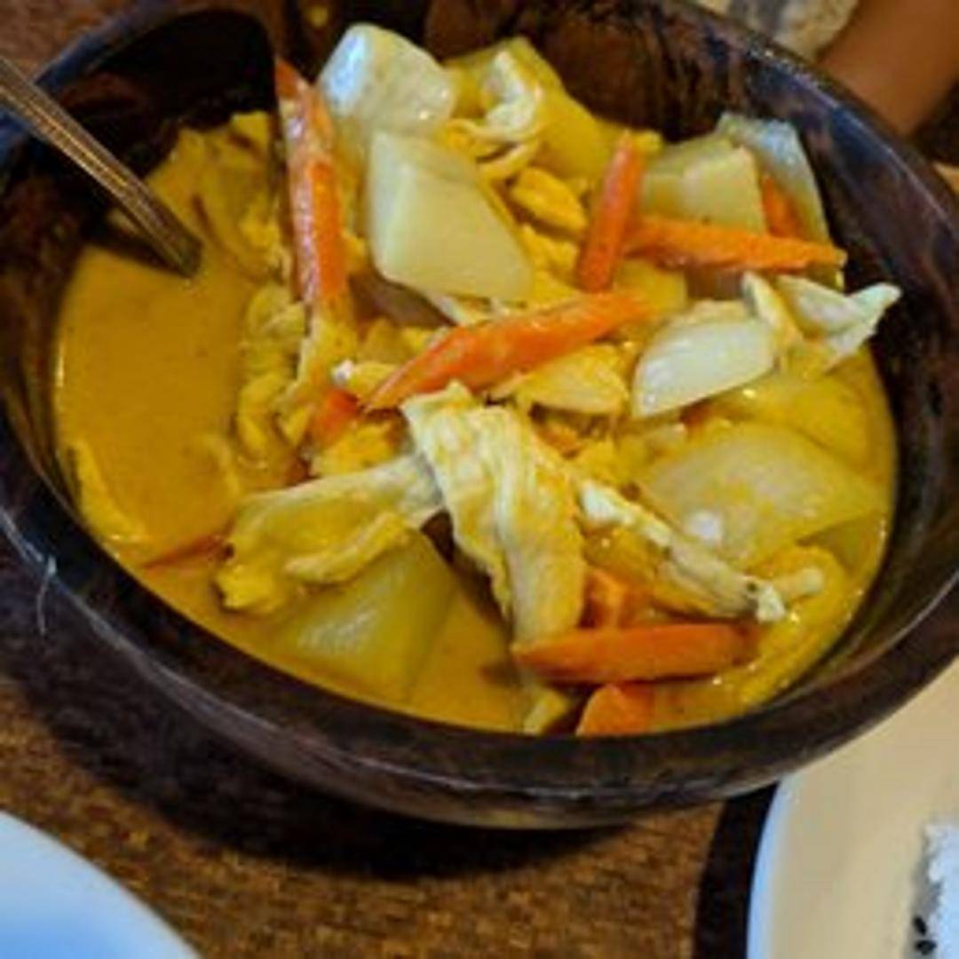 Tender chicken simmered in a flavorful curry sauce with potatoes, carrots, and onions. Served with steamed rice.