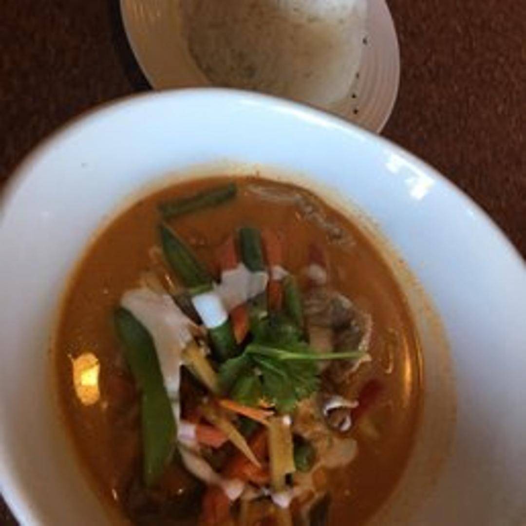 Creamy and rich Panang curry with coconut milk, bell peppers, and basil leaves. Your choice of protein, served with steamed rice.