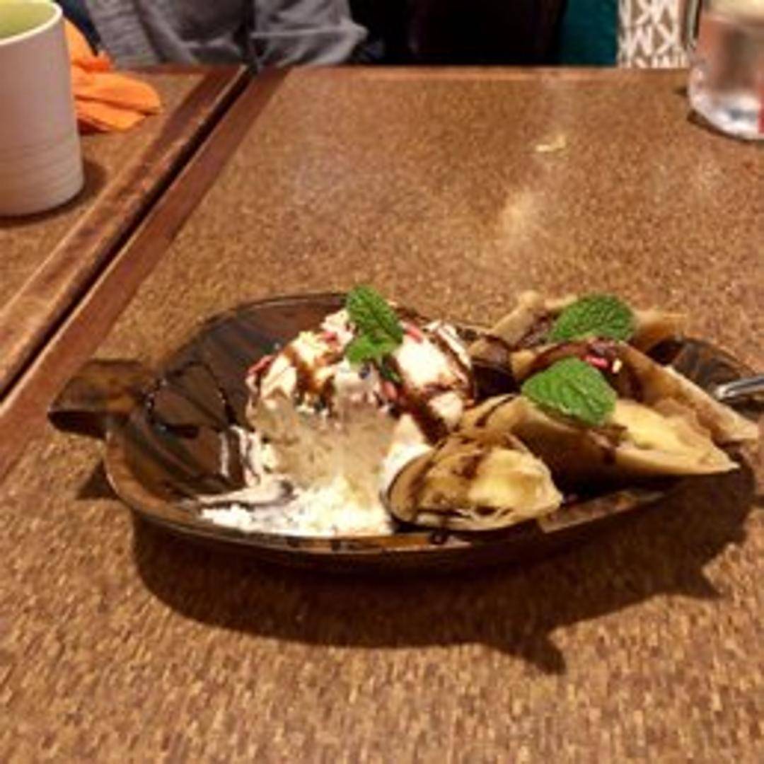Ripe bananas coated in a light batter and deep-fried until golden brown and crispy. Served warm, often drizzled with honey or chocolate sauce and sprinkled with sesame seeds.