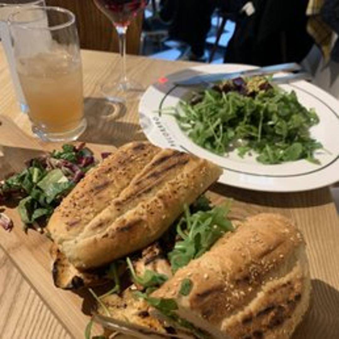 Grilled chicken panini with a flavorful combination of ingredients. Tender chicken breast paired with melted provolone cheese, roasted red peppers, and a pesto aioli, pressed to golden perfection on artisan bread.