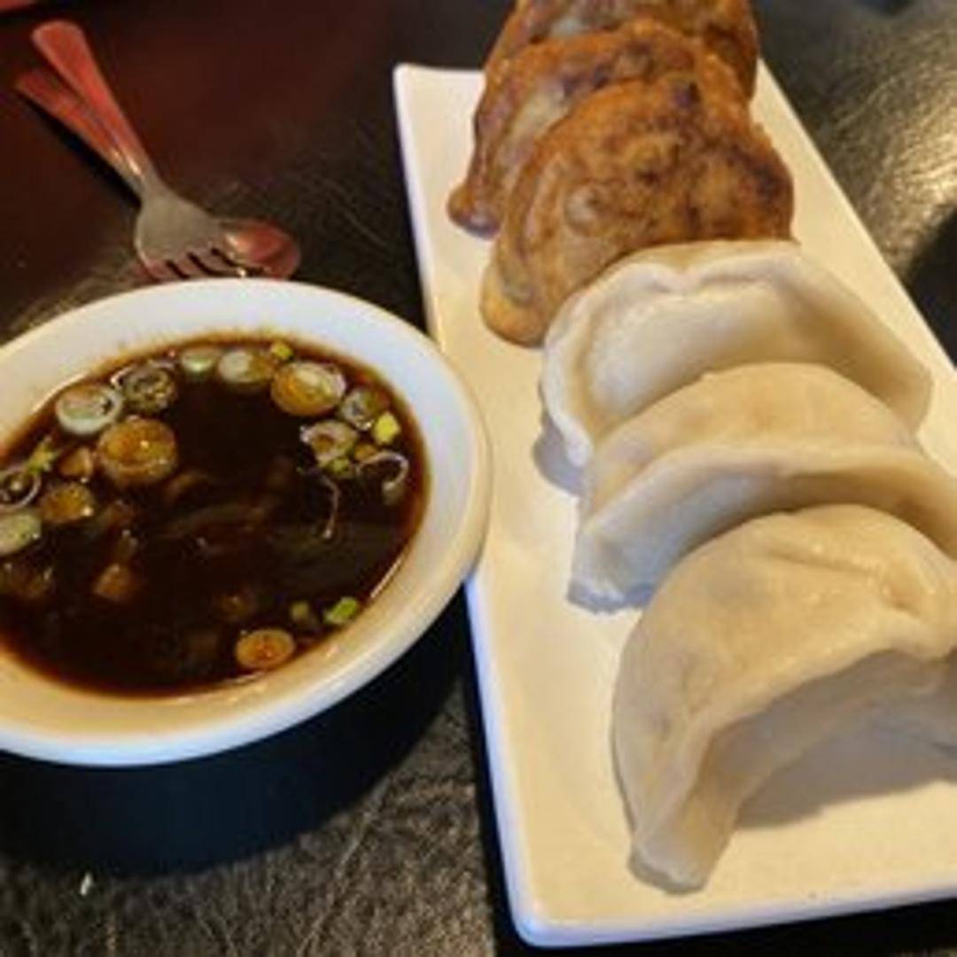 Tender, steamed dumplings filled with a savory mixture of seasoned ground meat and finely chopped vegetables. Served with a side of dipping sauce.