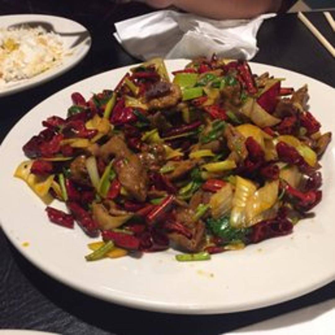 Tender slices of lamb stir-fried with a vibrant blend of spices, chili peppers, and aromatic vegetables. Served with a savory sauce over a bed of rice or noodles (optional).