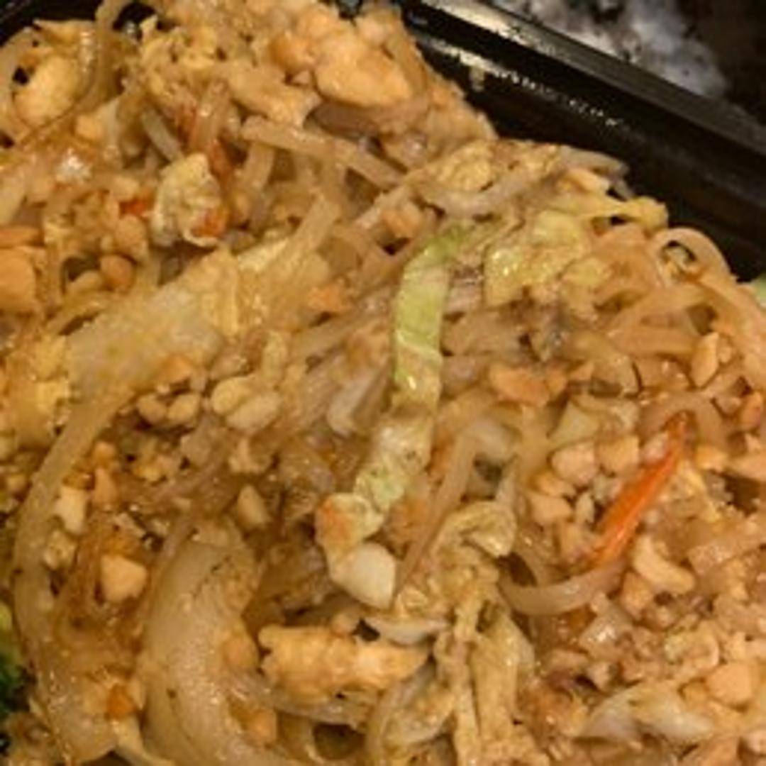 A classic Thai noodle stir-fry with rice noodles, shrimp or chicken (optional), tofu, bean sprouts, scallions, and peanuts, tossed in a tangy tamarind sauce. Garnished with lime.