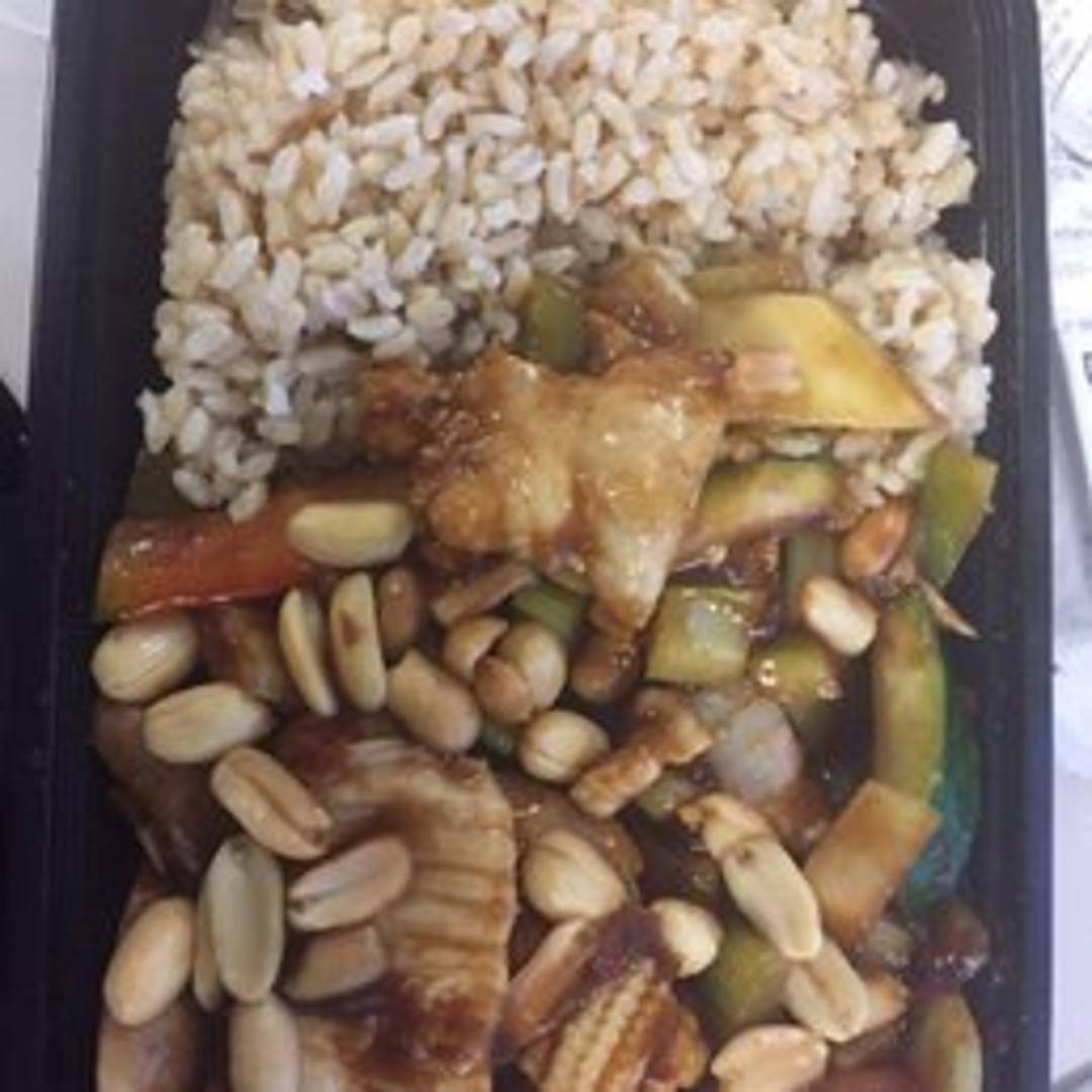 Diced chicken stir-fried with peanuts, vegetables, and chili peppers in a spicy Kung Pao sauce. Served with white rice.