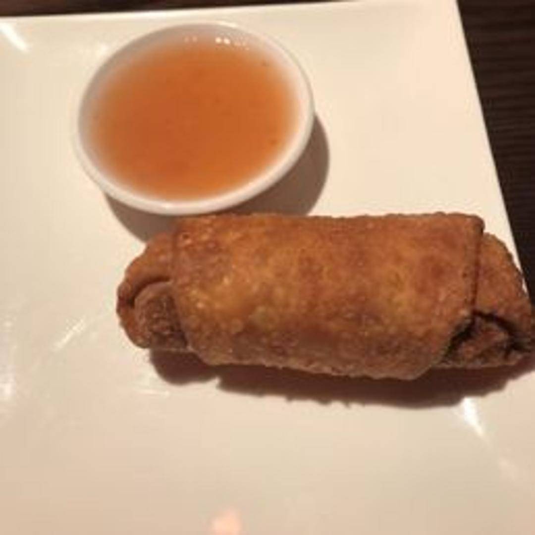 Crispy, golden-brown egg roll filled with a savory mixture of shredded cabbage, carrots, celery, and seasoned ground pork or vegetables, all wrapped in a thin, fried wrapper. Served with a side of sweet chili dipping sauce.