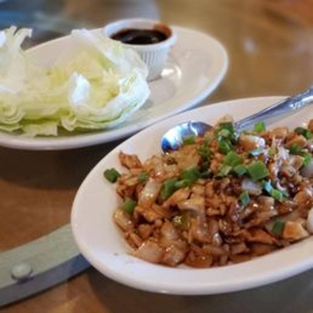 Savory stir-fried minced chicken with water chestnuts, mushrooms, and green onions, served with crisp lettuce cups for wrapping.