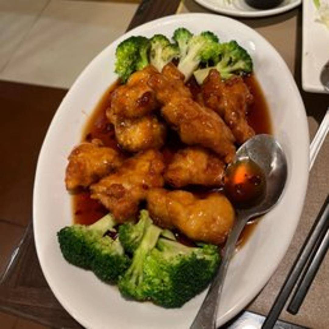Crispy, lightly battered chicken in a sweet and spicy General Tso's sauce. Served with steamed white rice.