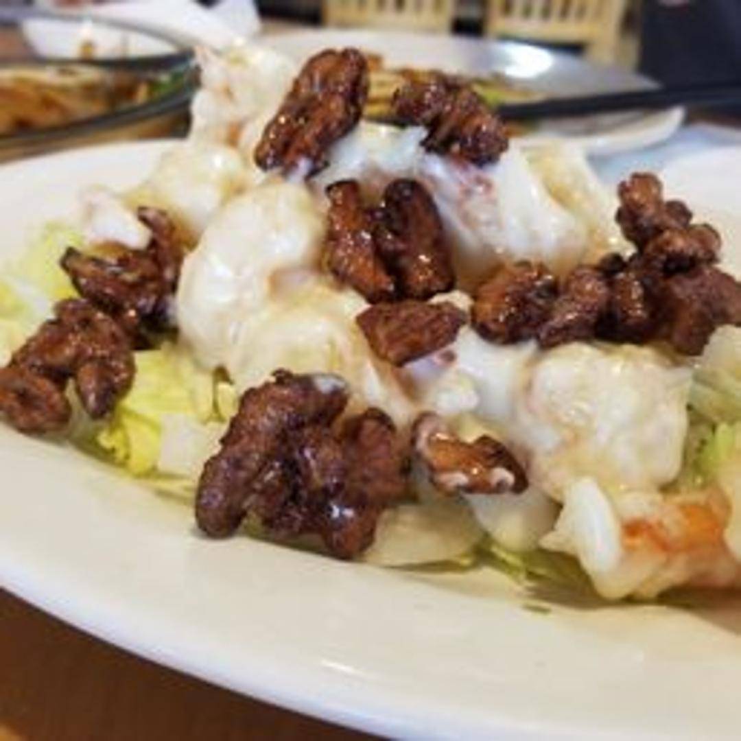 Lightly battered and fried shrimp tossed in a creamy, sweet sauce, topped with candied walnuts and served on a bed of lettuce.