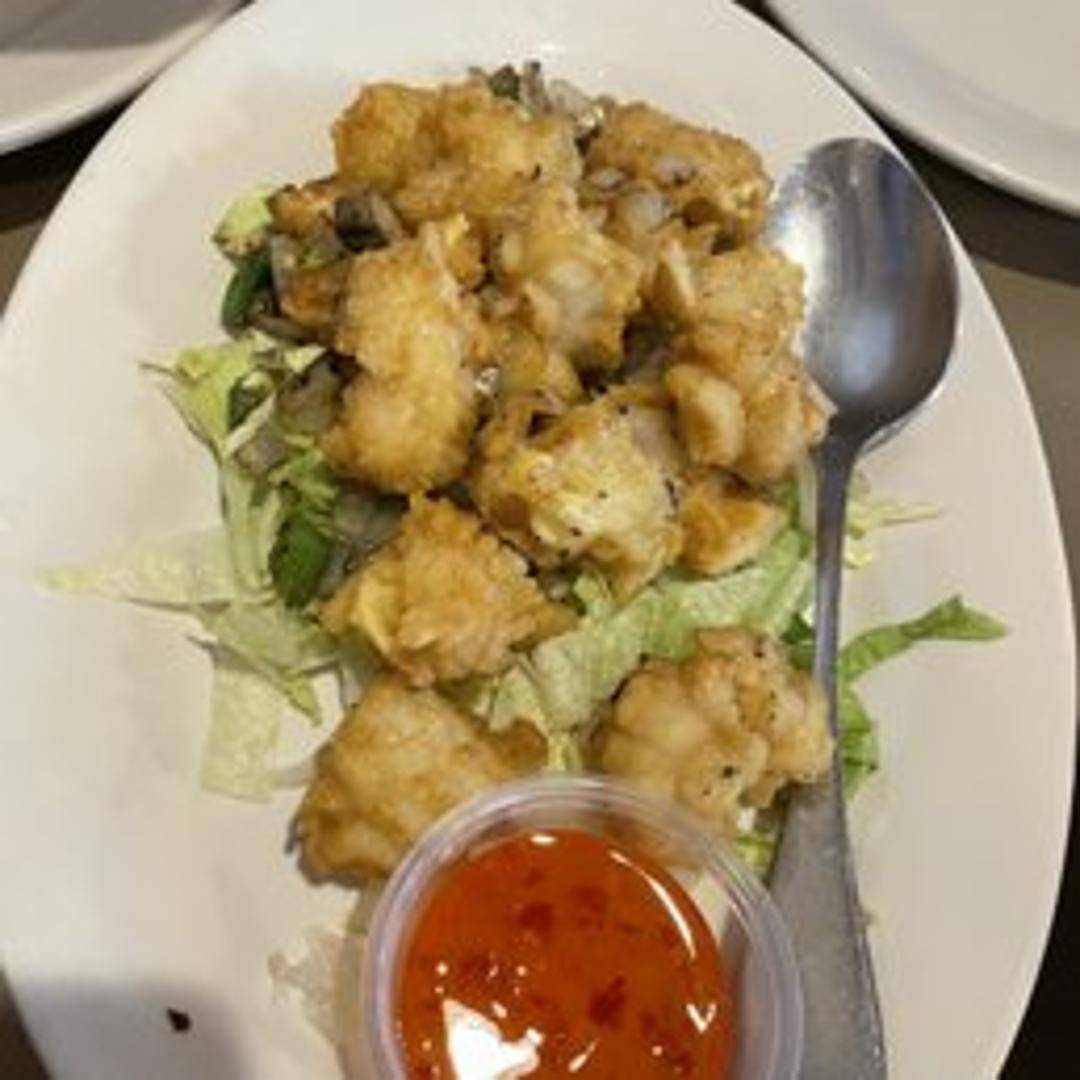 Tender squid rings lightly battered and wok-tossed with a generous coating of salt, pepper, chili flakes, garlic, and green onions. The result is a crispy, savory, and slightly spicy seafood dish, perfect as an appetizer.