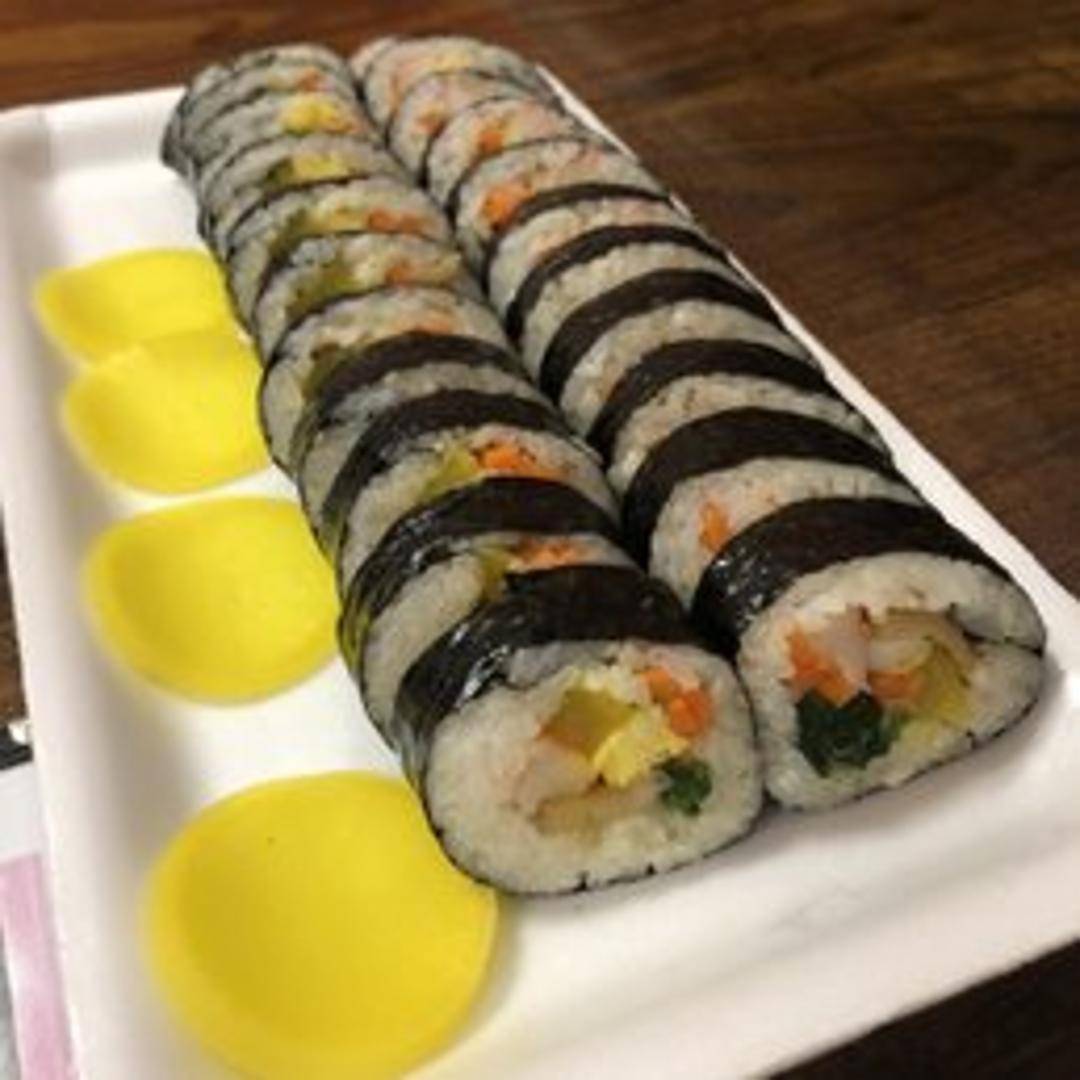 A popular Korean dish consisting of cooked rice and various ingredients, typically including an assortment of fresh or cooked vegetables, egg strips, and often marinated meat or fish cake, all tightly rolled in dried sheets of seaweed (gim) and sliced into bite-sized rounds. Seasoned with sesame oil and a hint of salt, Kimbap offers a delightful blend of textures and savory flavors, perfect as a light meal or snack.