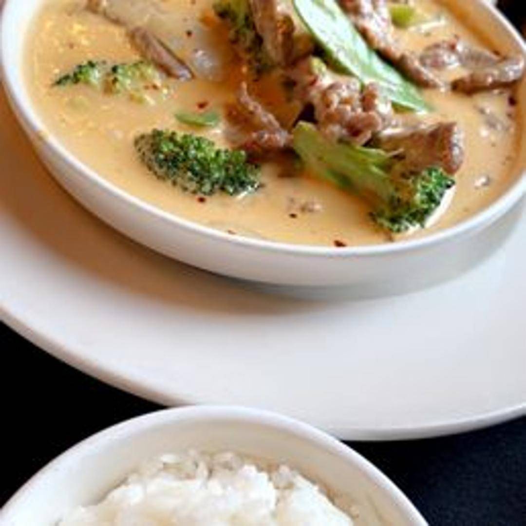 Creamy and slightly sweet Panang curry with coconut milk, bell peppers, and your choice of protein.