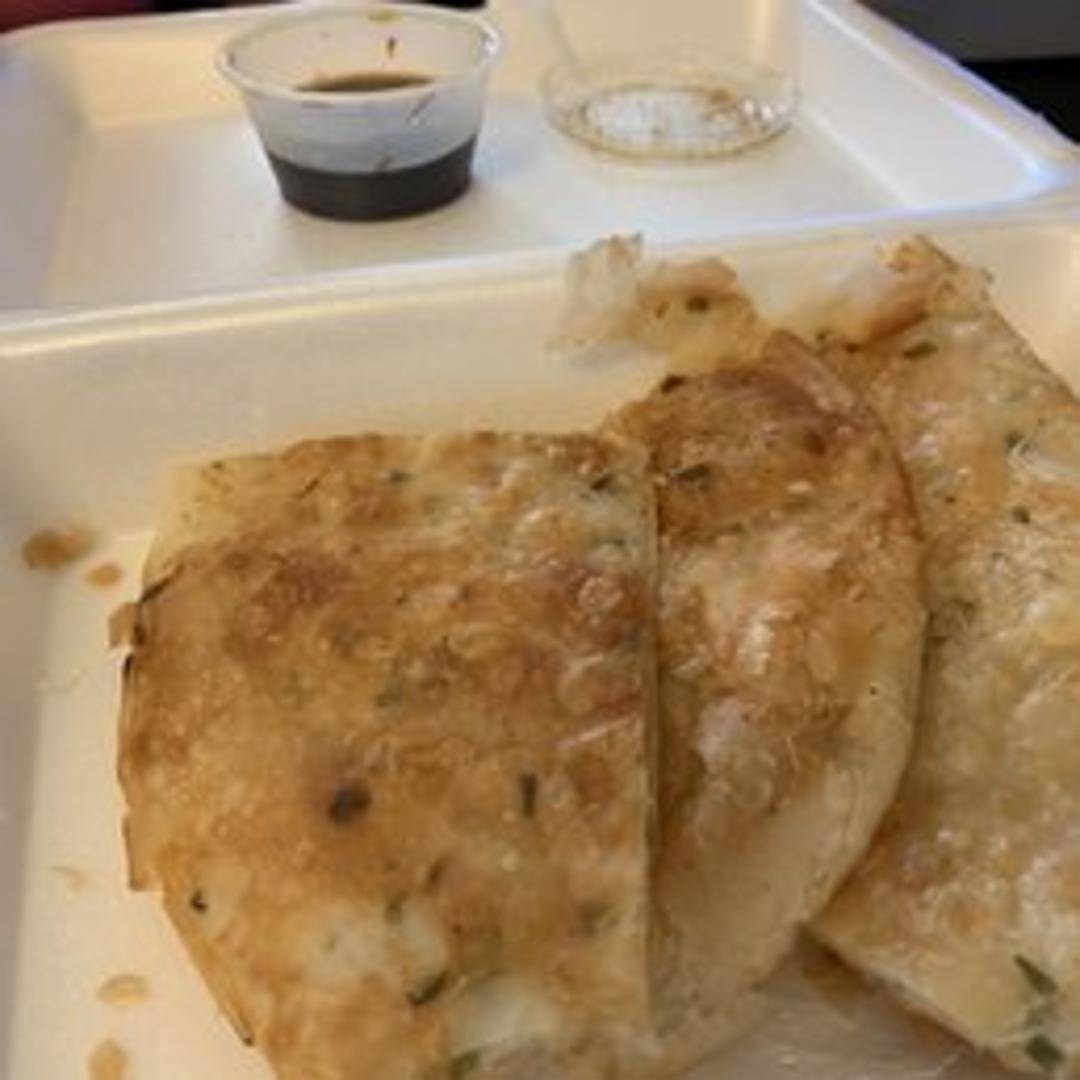 Crispy, savory pancake made with layers of dough and chopped scallions, served with a dipping sauce.