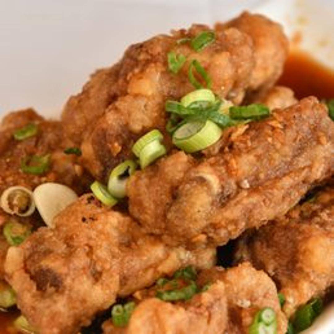 Tender pork ribs marinated in a flavorful garlic sauce, then fried to a crispy golden brown. A savory and satisfying dish with a delicious garlic aroma.