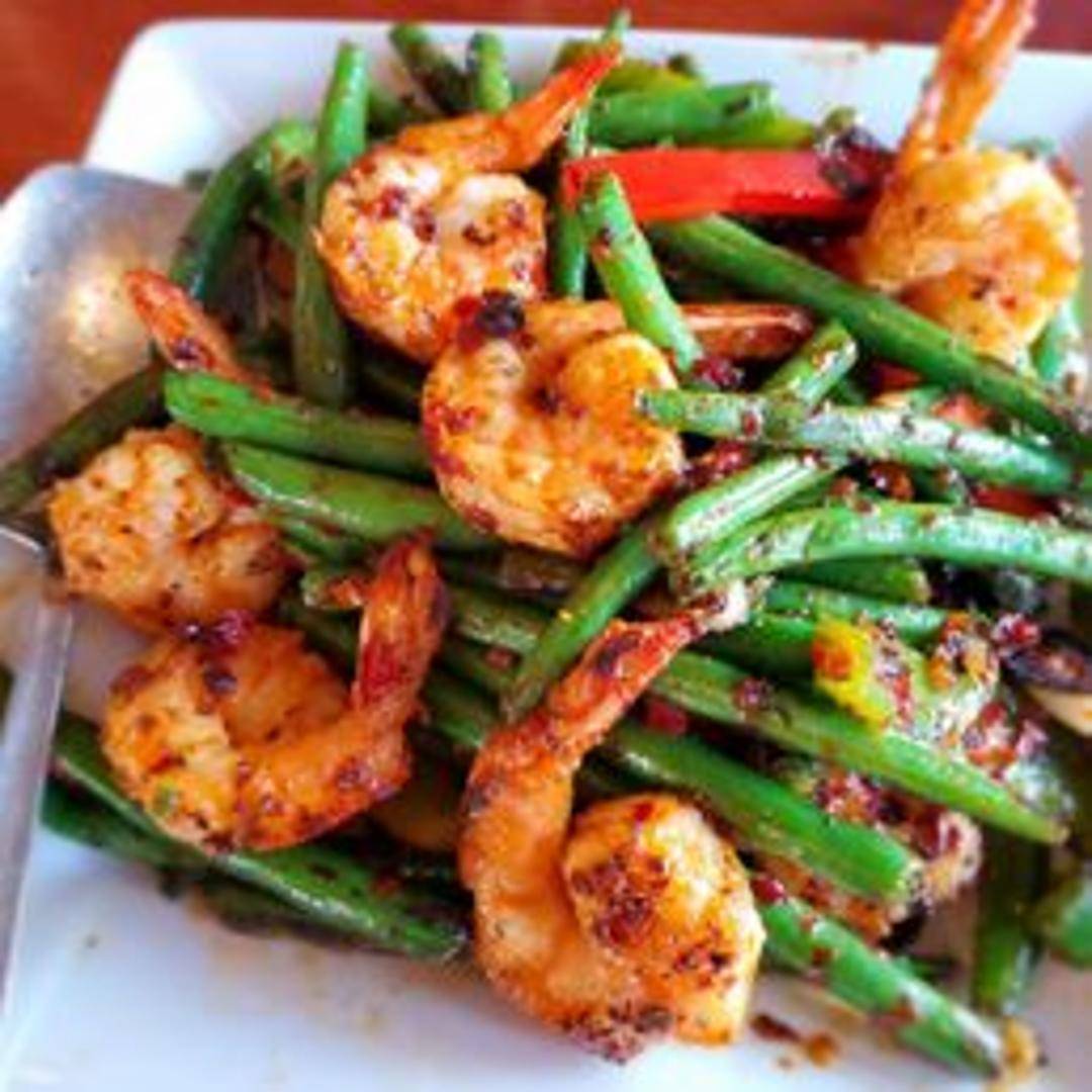 Succulent shrimp stir-fried with string beans in a spicy and aromatic Malaysian sauce, served with rice.