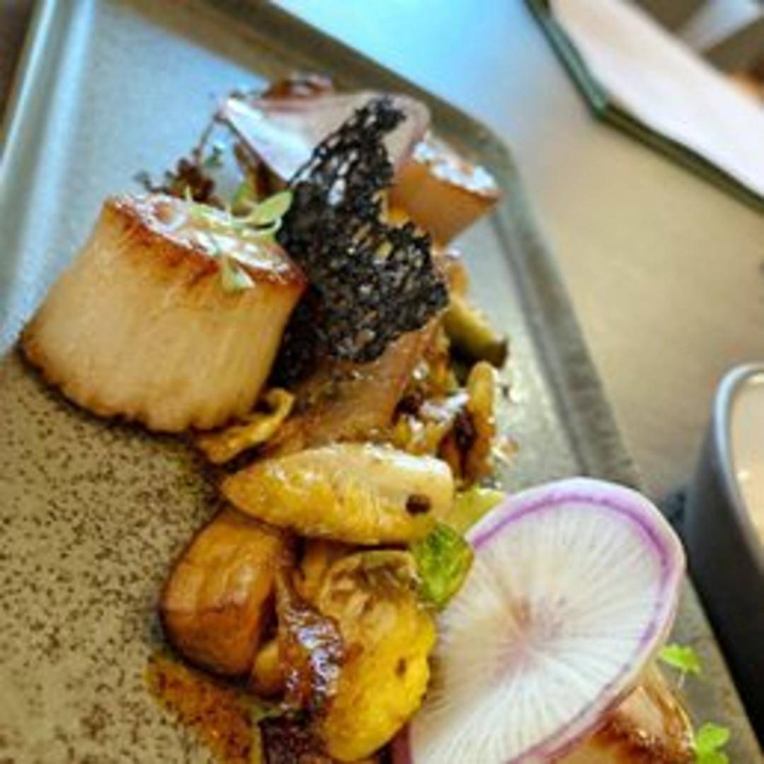 Perfectly seared, plump sea scallops featuring a beautiful golden crust and a sweet, tender interior. Artfully presented with complementary seasonal ingredients, such as a velvety purée or vibrant vegetables, and finished with a delicate sauce that accentuates their natural oceanic sweetness.