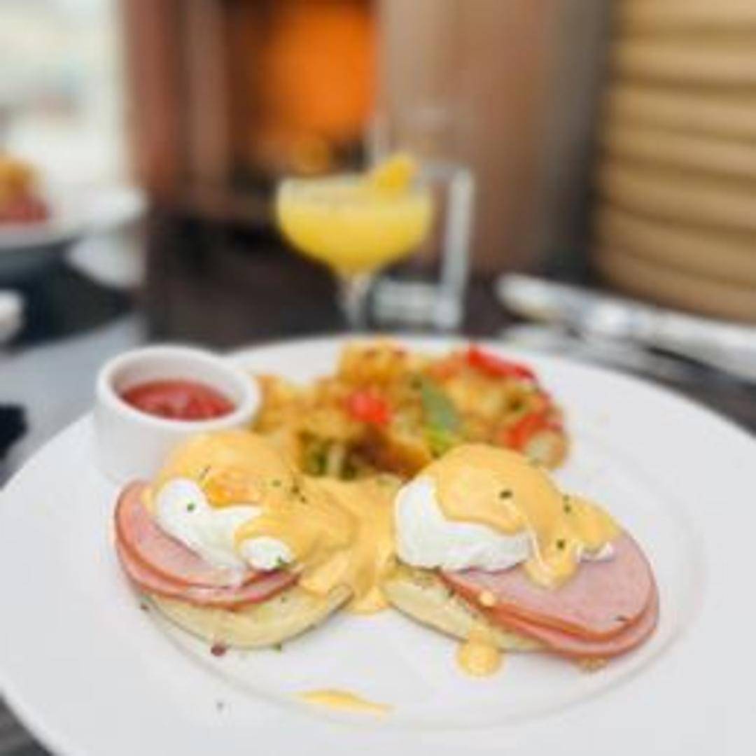 Classic Eggs Benedict featuring poached eggs and Canadian bacon atop toasted English muffins, smothered in rich Hollandaise sauce. Served with a side of breakfast potatoes.
