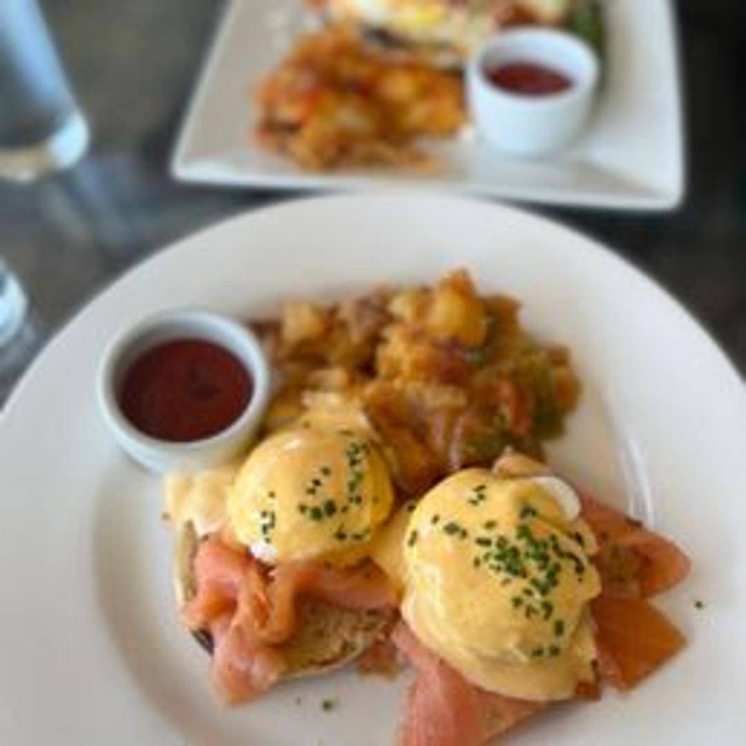 Elegant Eggs Benedict with thinly sliced smoked salmon instead of Canadian bacon, paired with poached eggs and creamy Hollandaise sauce on a toasted English muffin. Served with a side of breakfast potatoes.