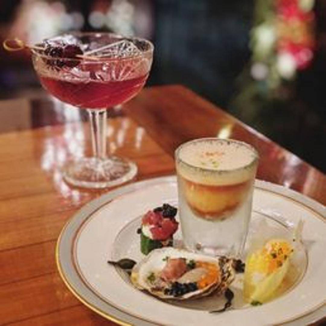Freshly shucked oysters served on a bed of ice with mignonette sauce, cocktail sauce, and lemon wedges.