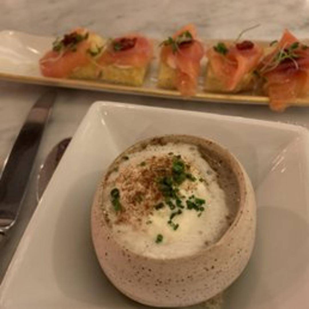 Creamy mushroom soup made with a variety of wild mushrooms, vegetable broth, and a touch of cream. Garnished with fresh herbs and truffle oil.