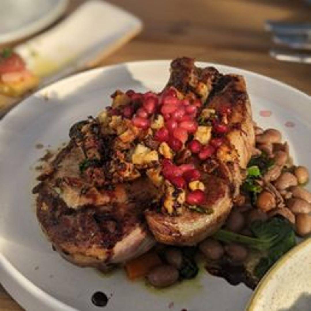 Pan-seared, bone-in pork chop, seasoned with herbs and spices. Served with seasonal vegetables and a pan jus.