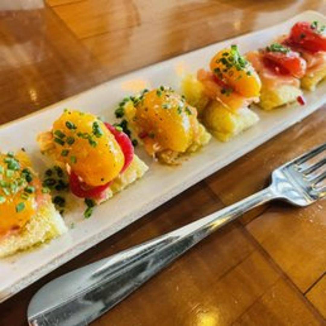 Toasted artisanal bread topped with thinly sliced smoked salmon, cream cheese or crème fraîche, dill, and often capers and red onion. Finished with a drizzle of olive oil and a sprinkle of black pepper.