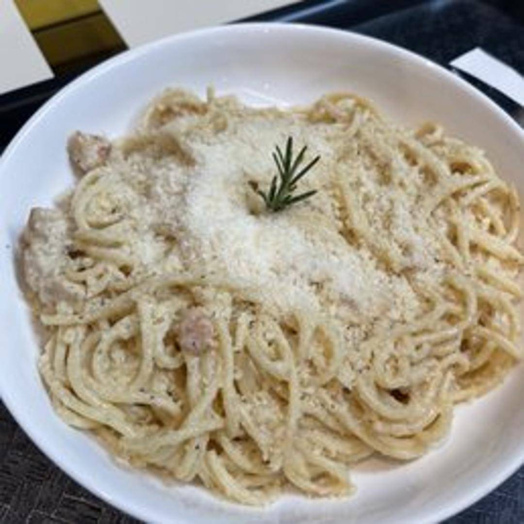 Spaghetti coated in a creamy Alfredo sauce, made with butter, Parmesan cheese, and cream, and topped with tender pieces of grilled chicken. A rich and comforting classic.