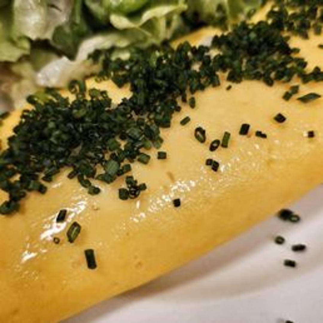 Classic French omelette cooked perfectly soft and creamy, served with a side of greens. Prepared with butter and fresh herbs.