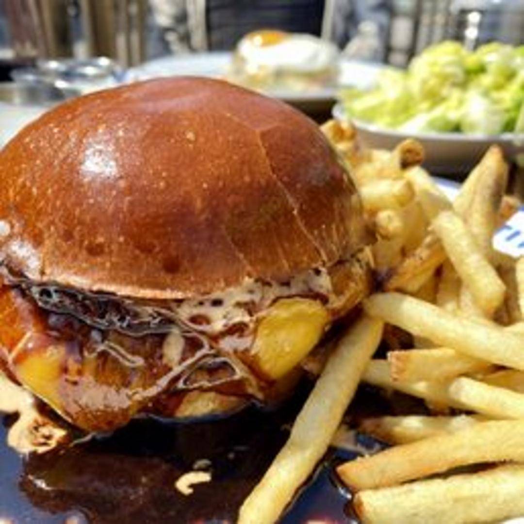 Two juicy beef patties, melted cheese, caramelized onions, and special sauce on a toasted bun. Served with fries.