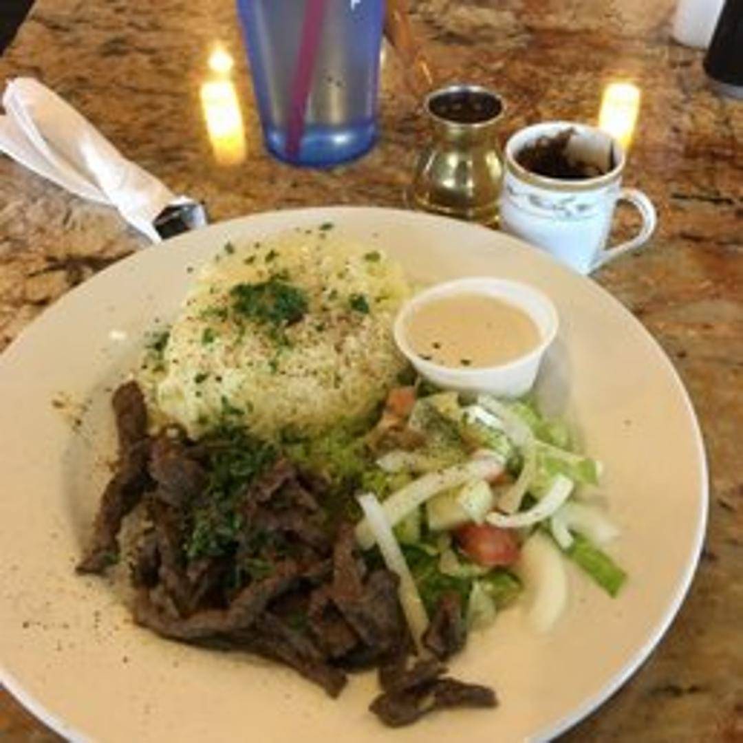 Thinly sliced, marinated beef roasted on a vertical spit, served in a pita bread with tahini sauce, lettuce, tomatoes, and onions.