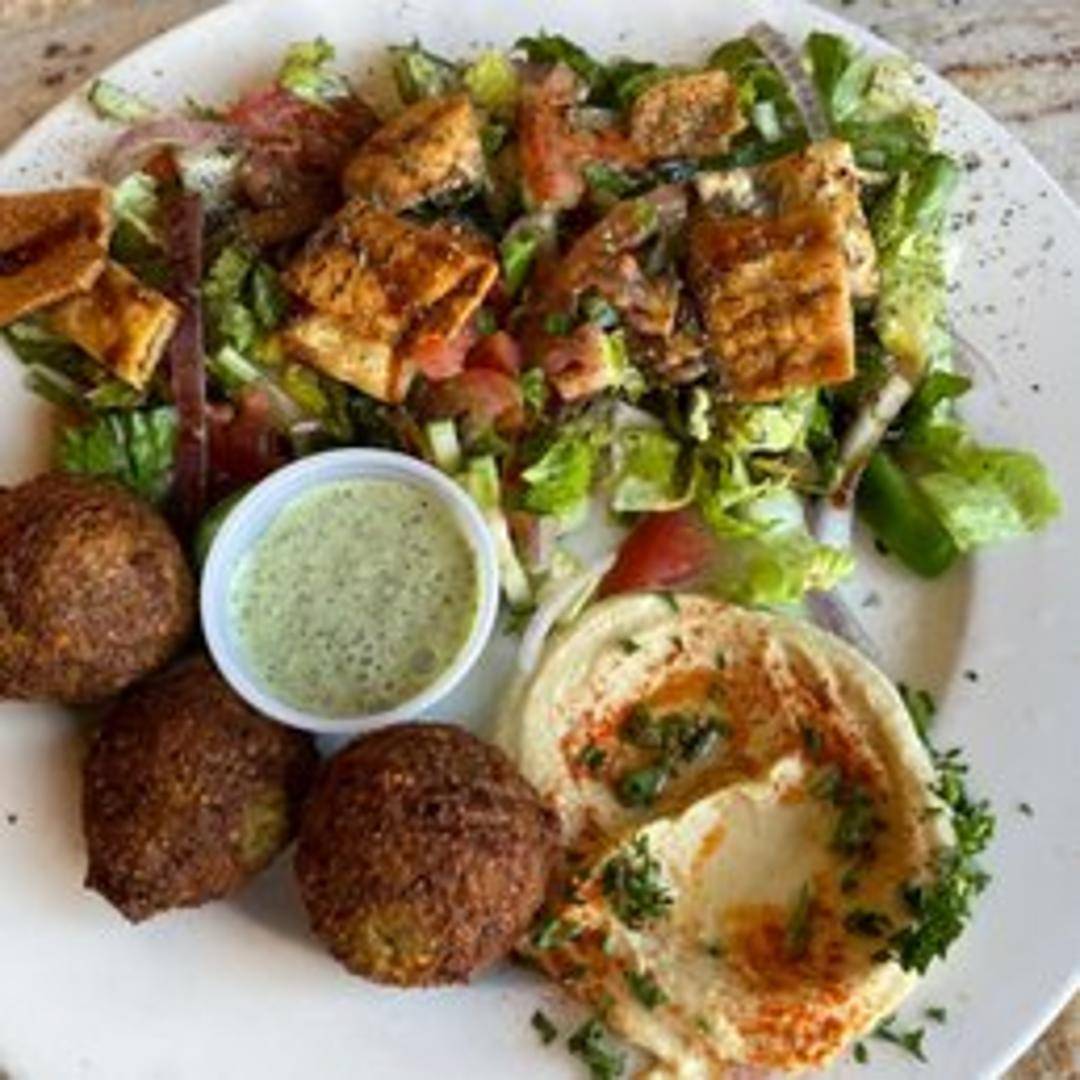 A combination plate featuring hummus, baba ghanouj, falafel, and grape leaves, served with pita bread.