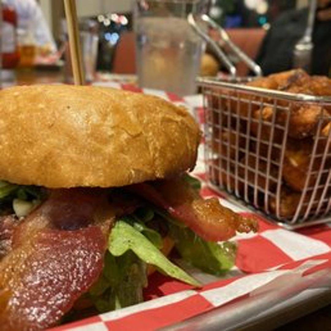 Our signature burger featuring a juicy patty, [Insert cheese description, e.g., cheddar cheese], [Insert topping description, e.g., lettuce, tomato, onion], and our special sauce on a toasted bun. Served with [Insert side dish, e.g., fries].