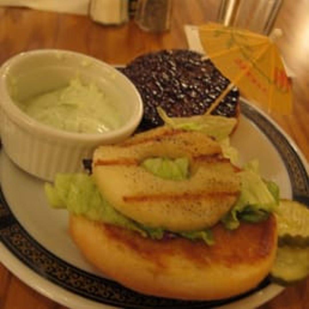 Grilled burger topped with Swiss cheese, grilled pineapple, teriyaki sauce, lettuce and tomato on a toasted bun.