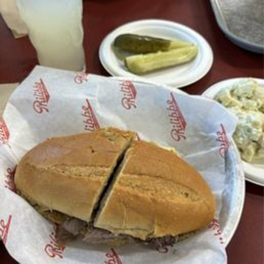 Thinly sliced, tender roast beef piled high on a freshly baked French roll. Typically served with a choice of cheese and au jus for dipping. Mustard is available at the tables.