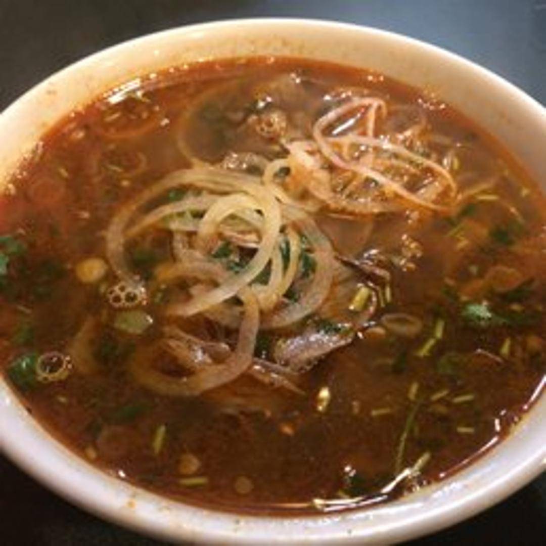 Spicy and flavorful Vietnamese noodle soup originating from Hue. Features thick rice noodles, tender beef slices, pork knuckles, and a rich broth seasoned with lemongrass, shrimp paste, and chili oil. Garnished with herbs and vegetables.