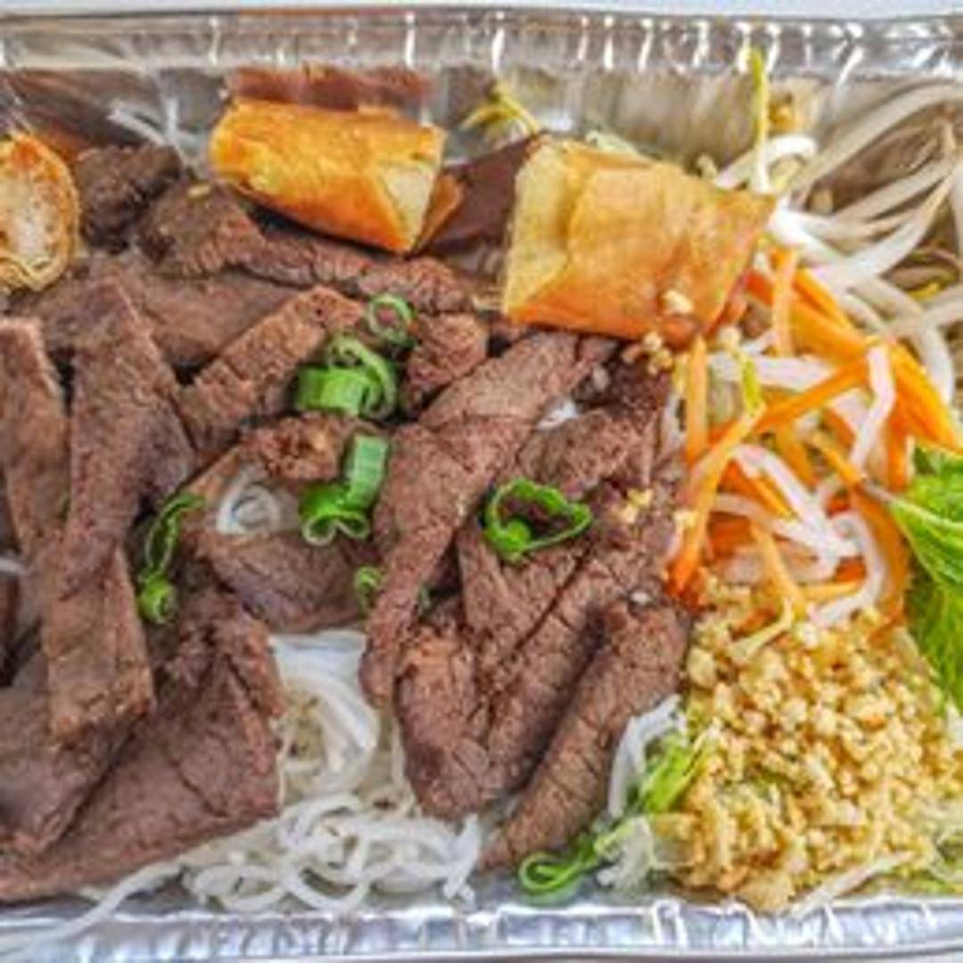 Vermicelli noodles topped with grilled pork, crispy spring rolls, fresh vegetables, and a savory fish sauce dressing. Sprinkled with peanuts.