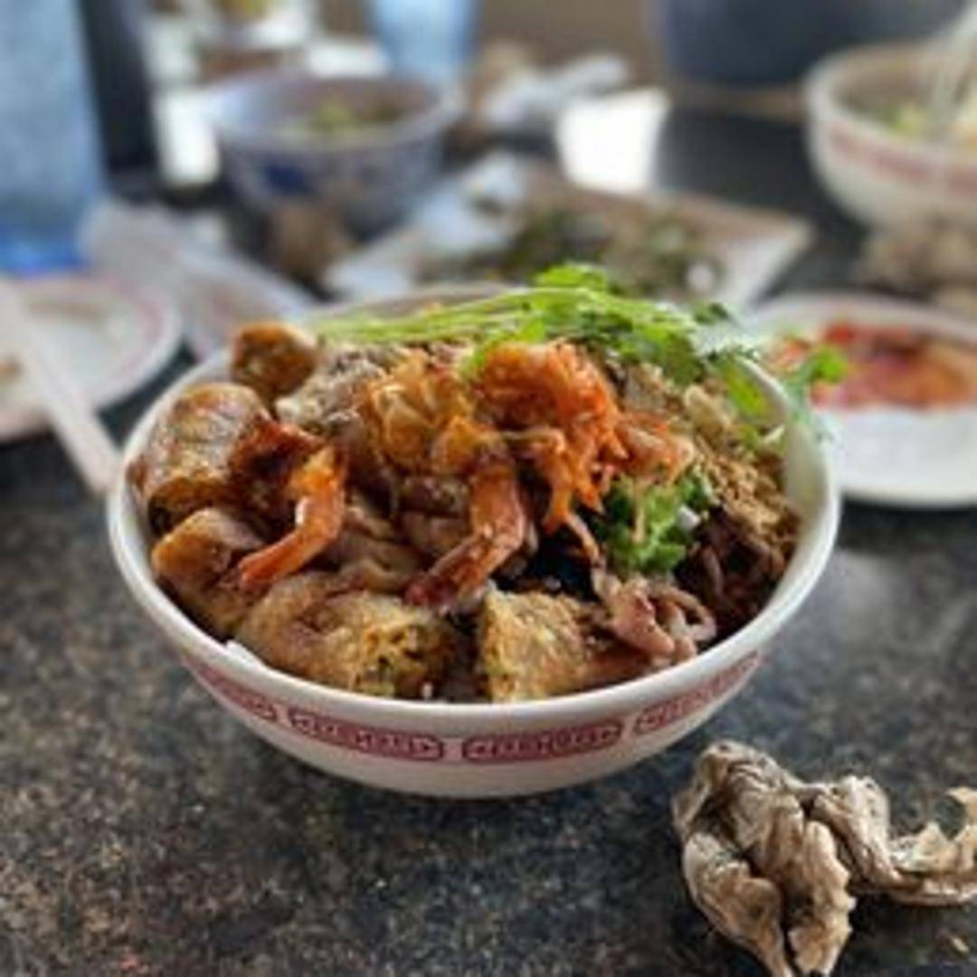 A customizable Vietnamese noodle bowl with cold vermicelli noodles as a base. Includes fresh vegetables, choice of grilled protein (e.g., pork, chicken, shrimp, tofu), and a flavorful nuoc cham (fish sauce-based) dressing. Topped with crushed peanuts for added texture and flavor.