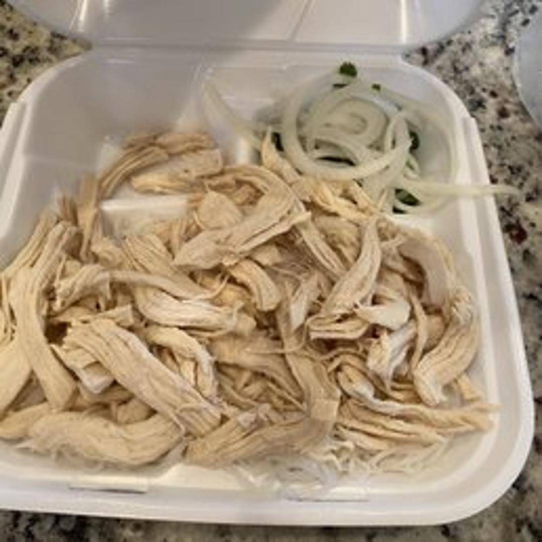 A comforting Vietnamese noodle soup featuring a flavorful chicken broth, rice noodles, and tender slices of chicken. Garnished with fresh herbs such as cilantro, basil, and bean sprouts, along with lime and jalapenos for added flavor.