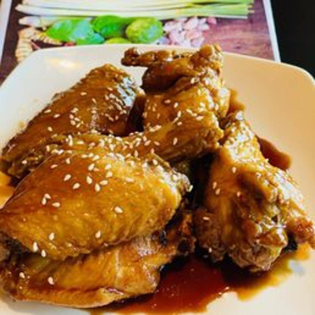 Oven-roasted chicken wings coated in a sweet and savory sesame sauce, creating a delicious and aromatic appetizer.