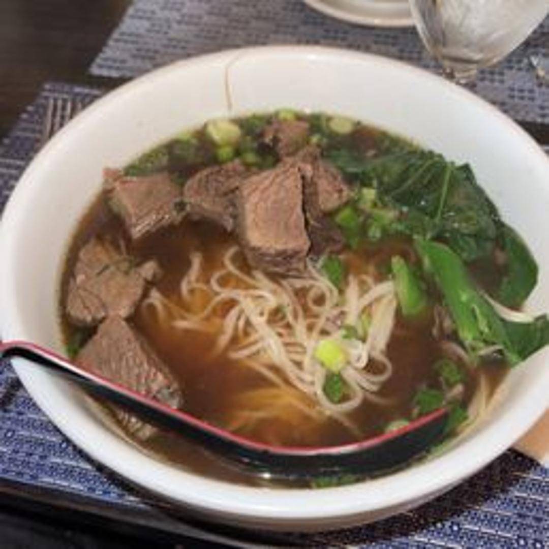 A comforting and flavorful noodle soup featuring tender, slow-cooked beef in a rich and aromatic broth. Served with noodles and garnished with fresh herbs and vegetables. A hearty and satisfying meal.