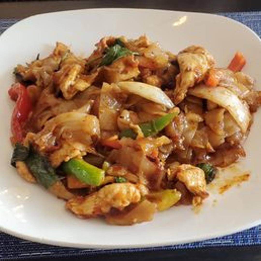 Wide rice noodles stir-fried with chili, garlic, basil, onions, bell peppers, and your choice of protein (typically chicken, pork, beef, or tofu). A spicy and flavorful noodle dish, perfect for those who like a kick.