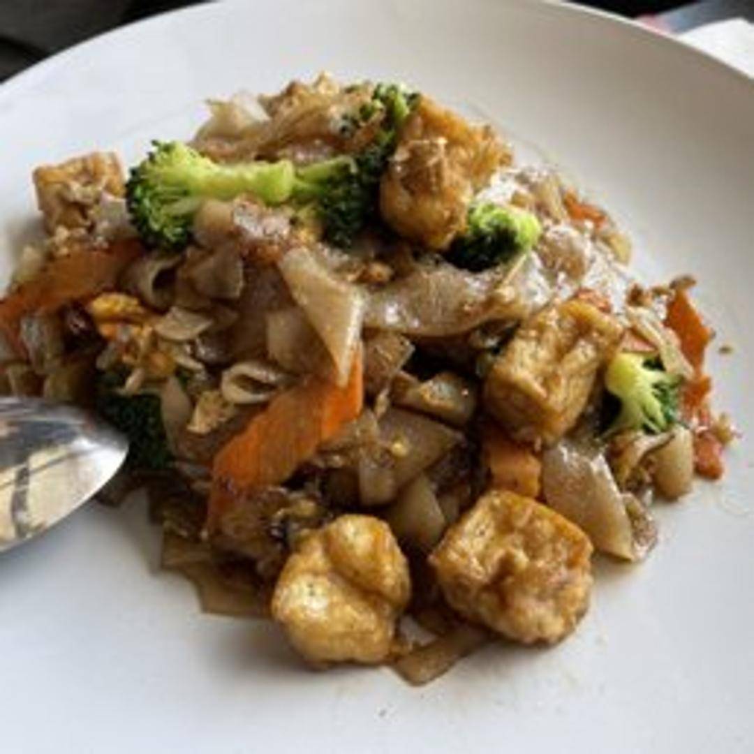 Wide rice noodles stir-fried with Chinese broccoli, egg, and your choice of protein in a savory soy-based sauce.