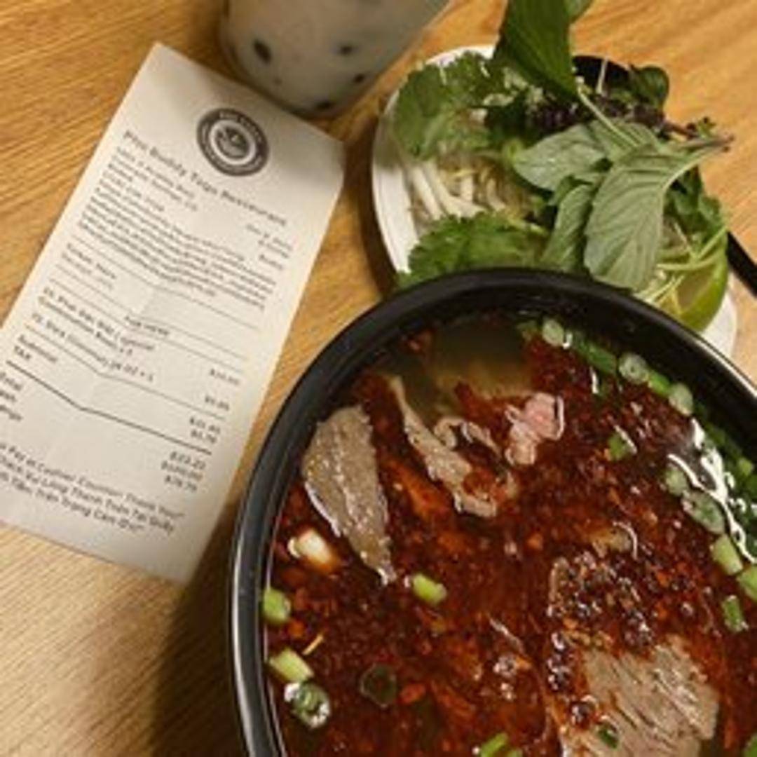 Special combination Vietnamese rice noodle soup with a variety of meats, including sliced beef, brisket, tendon, and meatballs. Garnished with fresh herbs, onions, and lime.