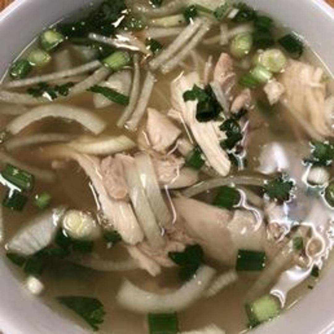 Classic Vietnamese rice noodle soup with tender shredded chicken in a flavorful broth. Garnished with fresh herbs, onions, and lime.