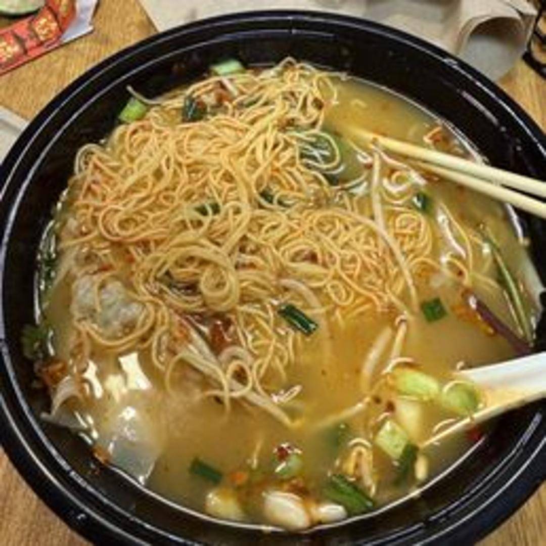 Egg noodle soup with wontons filled with seasoned pork and shrimp. Served in a clear broth with vegetables.