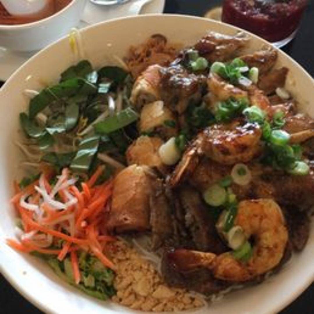 A refreshing and vibrant Vietnamese noodle salad, featuring tender slices of marinated grilled beef served over a bed of cool vermicelli noodles, crisp lettuce, cucumbers, shredded carrots, and bean sprouts. Garnished with crushed peanuts and fried shallots, served with a side of savory Nuoc Cham dressing.