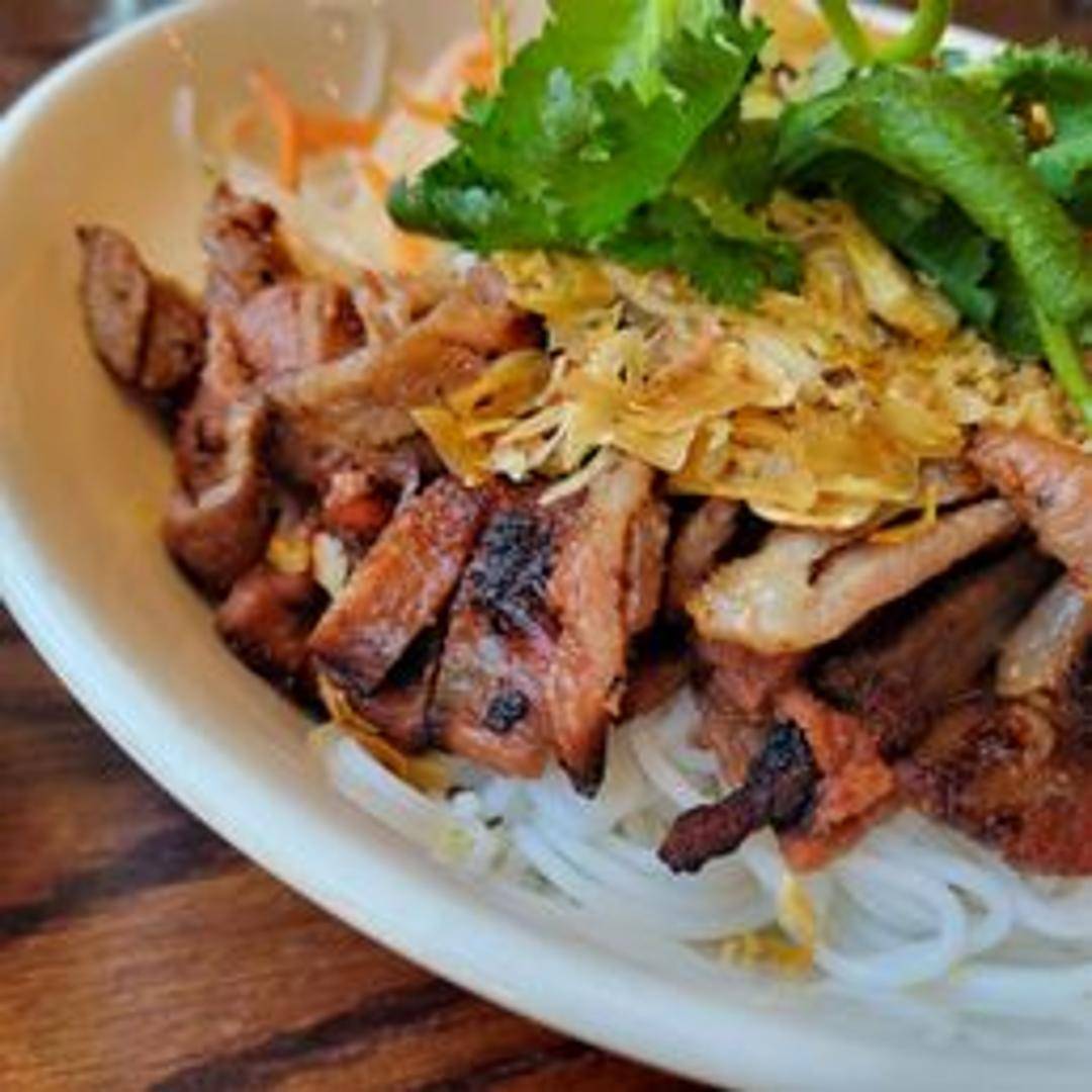 A refreshing and light Vietnamese noodle salad featuring grilled or sauteed marinated pork served over a bed of cold vermicelli noodles. The dish includes crisp shredded lettuce, pickled carrots and daikon radish, cucumber slices, bean sprouts, and fresh mint. It's topped with crushed peanuts and a flavorful nuoc cham (fish sauce-based) dressing for a delightful balance of savory, sweet, and tangy flavors.