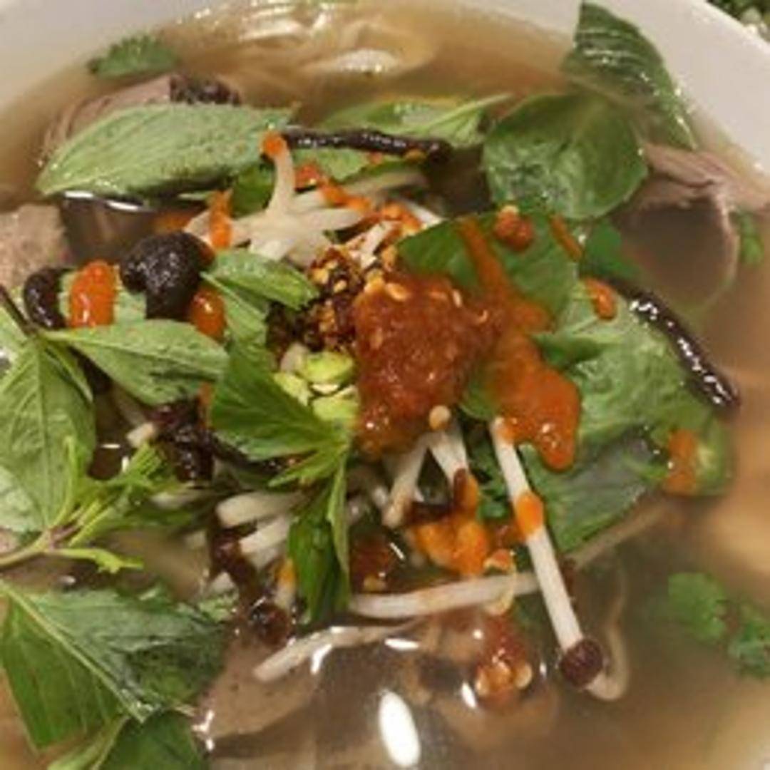 The 'Special' Pho, a traditional Vietnamese noodle soup with a rich beef broth base. It typically includes a combination of various cuts of beef such as rare steak, brisket, tendon, and tripe. Served with rice noodles, fresh herbs (basil, cilantro, mint), bean sprouts, lime, and jalapenos.