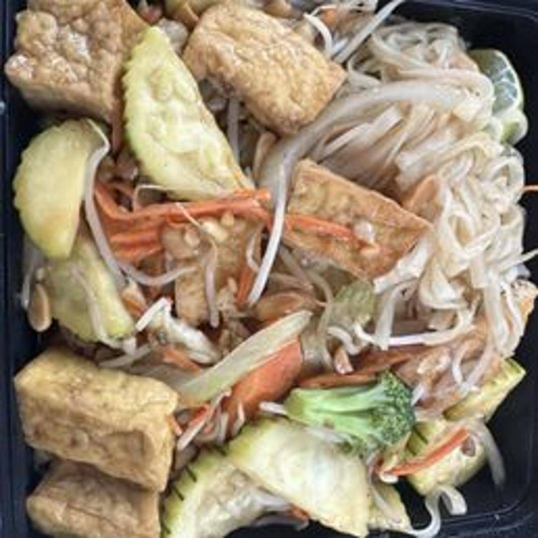 Stir-fried rice noodles with shrimp or chicken, eggs, bean sprouts, and peanuts in a tangy Pad Thai sauce.