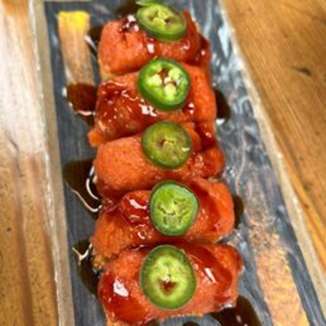 Crispy rice cakes topped with spicy tuna, avocado, and a drizzle of flavorful sauce.